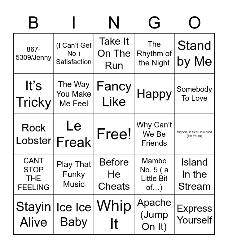 This bingo card has a free space and 74 words: Love Grows ( where My Rosemary Goes), Take Me Home Tonight, Take It On The Run, Tainted Love, Y.M.C.A, Bohemian Rhapsody, Fight For Your Right, I Will Survive, Stayin Alive, Jolene, Jump, Piano Man, Fancy Like, It’s Tricky, Dancing Queen, Le Freak, Hooked On A Feeling, Somebody To Love, U Can’t Touch This, Rock Lobster, The Way You Make Me Feel, (I Can’t Get No ) Satisfaction, The Rhythm of the Night, Brick House, Express Yourself, Do Wah Diddy Diddy, Girls Just Want To Have Fun, I’m Still Standing, Love Is A Battlefield, Bust A Move, Stand by Me, Disco Inferno, What I Like About You, Hey Mickey You’re so Fine, Freeze-Frame, Apache (Jump On It), Don’t You Want Me Baby, Kids In America, Love Shack, Sugar Sugar, Whip It, Ice Ice Baby, Shout, Pt 1 & 2, We Got The Beat, Heartbreaker, 867-5309/Jenny, Car wash, Play That Funky Music, Margaritaville, The Longest Time, Addicted To Love, Let’s Dance, Signed,Sealed,Delivered (I’m Yours), I’m Coming Out, She’s A Lady, Into The Groove, Before He Cheats, Friends In Low Places, Manic Monday, Island In the Stream, Happy, Tubthumping, CANT STOP THE FEELING, Just Dance, Why Can’t We Be Friends, Do You Believe In Magic, (I just) Died In Your Arms, You Belong With Me, Mambo No. 5 ( a Little Bit of…), It’s Five O’clock Somewhere, The Sign, Wannabe, Don’t Go Breaking My Heart and No Scrubs.