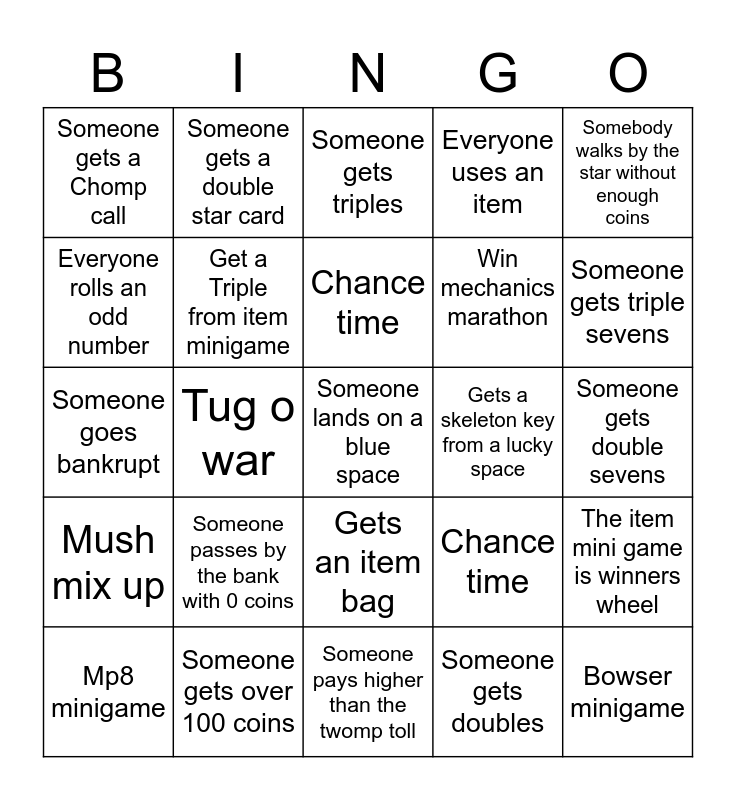 This bingo card has a free space and 24 words: Someone passes by the bank with 0 coins, Someone gets over 100 coins, Chance time, Mp8 minigame, Somebody walks by the star without enough coins, Someone gets a Chomp call, Everyone rolls an odd number, Someone gets a double star card, Gets a skeleton key from a lucky space, Gets an item bag, Win mechanics marathon, Someone goes bankrupt, Chance time, The item mini game is winners wheel, Get a Triple from item minigame, Someone gets doubles, Someone gets double sevens, Someone gets triples, Someone gets triple sevens, Tug o war, Bowser minigame, Mush mix up, Everyone uses an item and Someone pays higher than the twomp toll.