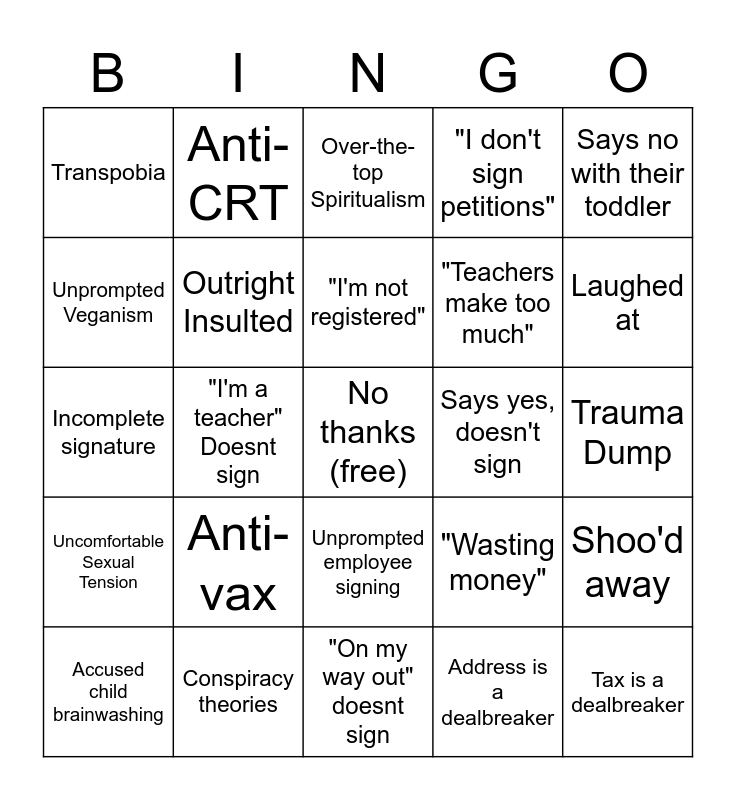 This bingo card has a free space and 24 words: Anti-vax, Conspiracy theories, "I'm not registered", Accused child brainwashing, Says no with their toddler, Transpobia, Unprompted Veganism, Anti-CRT, Says yes, doesn't sign, Unprompted employee signing, "Teachers make too much", Incomplete signature, "Wasting money", Shoo'd away, Outright Insulted, Address is a dealbreaker, Trauma Dump, Over-the-top Spiritualism, Laughed at, "I'm a teacher" Doesnt sign, Tax is a dealbreaker, Uncomfortable Sexual Tension, "I don't sign petitions" and "On my way out" doesnt sign.