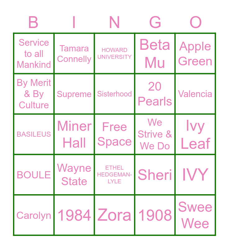 This bingo card has a free space and 40 words: SALMON PINK, BASILEUS, J15, Supreme, 1984, ETHEL HEDGEMAN-LYLE, Sisterhood, SORORITY, Apple Green, BOULE, Miner Hall, Beta Mu, Swee Wee, Ivy Leaf, We Strive & We Do, Wayne State, Sisterly Relations, Service to all Mankind, Legacy, HOWARD UNIVERSITY, IVY, 1908, 20 Pearls, By Merit & By Culture, Pam Taylor, Barbara Evans, Faye B. Bryant, Alpha Rho Omega, 38th AKA Versary, Juju, Nancy, Carolyn, Wendy, Sheri, Valencia, Zora, Lisa, Fight Against Apartheid Ball, Tamara Connelly and Steppin’.