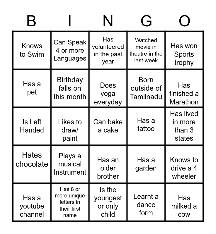 This bingo card has 25 words: Plays a musical Instrument, Is the youngest or only child, Does yoga everyday, Has a youtube channel, Has won Sports trophy, Knows to Swim, Has a pet, Can Speak 4 or more Languages, Has a tattoo, Has an older brother, Born outside of Tamilnadu, Is Left Handed, Has a garden, Knows to drive a 4 wheeler, Birthday falls on this month, Has milked a cow, Has lived in more than 3 states, Has volunteered in the past year, Has finished a Marathon, Likes to draw/ paint, Can bake a cake, Has 8 or more unique letters in their first name, Hates chocolate, Watched movie in theatre in the last week and Learnt a dance form.