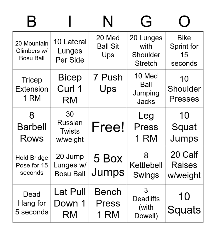 This bingo card has a free space and 24 words: 20 Jump Lunges w/ Bosu Ball, Lat Pull Down 1 RM, 7 Push Ups, Dead Hang for 5 seconds, Bike Sprint for 15 seconds, 20 Mountain Climbers w/ Bosu Ball, Tricep Extension 1 RM, 10 Lateral Lunges Per Side, Leg Press 1 RM, 5 Box Jumps, 10 Med Ball Jumping Jacks, 8 Barbell Rows, 8 Kettlebell Swings, 20 Calf Raises w/weight, Bicep Curl 1 RM, 3 Deadlifts (with Dowell), 10 Squat Jumps, 20 Med Ball Sit Ups, 10 Shoulder Presses, 30 Russian Twists w/weight, 10 Squats, Hold Bridge Pose for 15 seconds, 20 Lunges with Shoulder Stretch and Bench Press 1 RM.