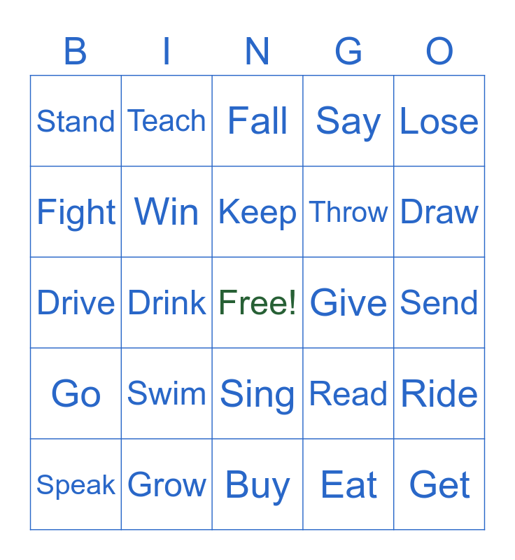 This bingo card has a free space and 24 words: Swim, Grow, Keep, Speak, Lose, Stand, Fight, Teach, Give, Sing, Throw, Drive, Read, Ride, Win, Eat, Send, Fall, Draw, Drink, Get, Go, Say and Buy.