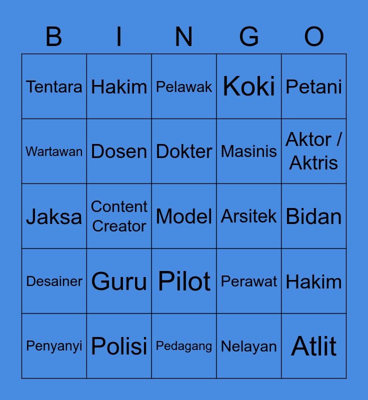 This bingo card has a free space and 24 words: Guru, Polisi, Dokter, Penyanyi, Petani, Tentara, Wartawan, Hakim, Arsitek, Pilot, Masinis, Jaksa, Perawat, Hakim, Dosen, Nelayan, Bidan, Pelawak, Aktor / Aktris, Content Creator, Atlit, Desainer, Koki and Pedagang.