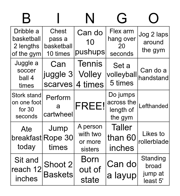 This bingo card has a free space and 24 words: Jump Rope 30 times, Shoot 2 Baskets, Tennis Volley 4 times, Sit and reach 12 inches, Jog 2 laps around the gym, Dribble a basketball 2 lengths of the gym, Juggle a soccer ball 4 times, Chest pass a basketball 10 times, Do jumps across the length of the gym, A person with two or more sisters, Set a volleyball 5 times, Stork stand on one foot for 30 seconds, Taller than 60 inches, Likes to rollerblade, Can juggle 3 scarves, Can do a layup, Lefthanded, Can do 10 pushups, Can do a handstand, Perform a cartwheel, Standing broad jump at least 5', Ate breakfast today, Flex arm hang over 20 seconds and Born out of state.