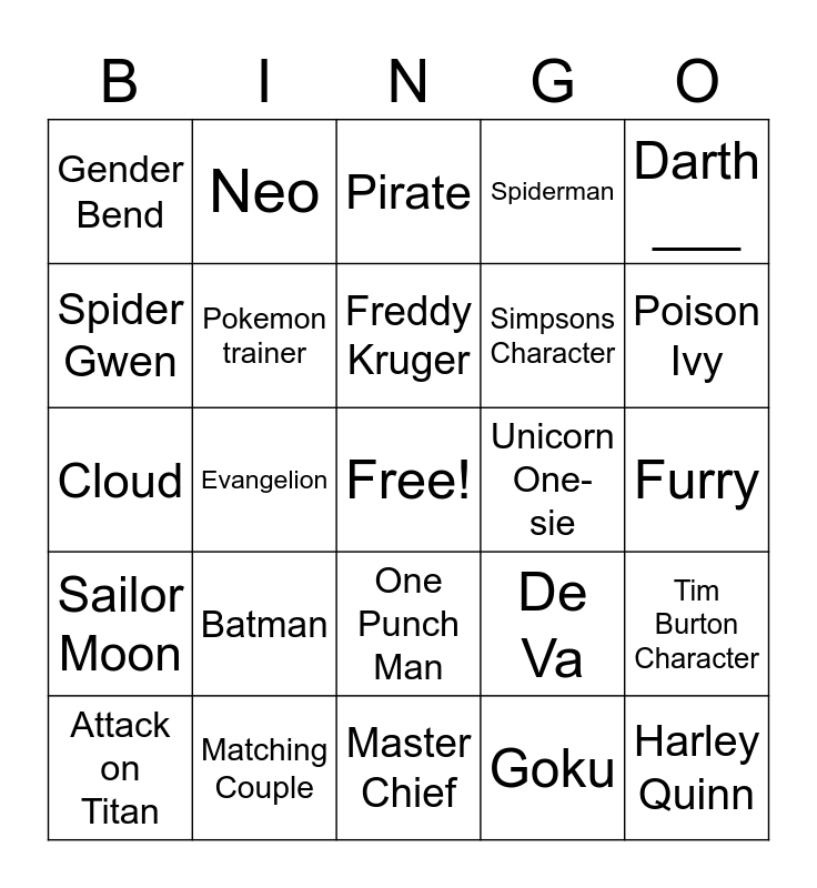 This bingo card has a free space and 27 words: De Va, Anyone with a pride flag, Simpsons Character, Master Chief, Spider Gwen, Pirate, Neo, Sailor Moon, Unicorn One-sie, Tim Burton Character, Cloud, Spiderman, Attack on Titan, Matching Couple, Poison Ivy, Jedi, Pokemon trainer, Freddy Kruger, Batman, Gender Bend, Furry, Goku, Evangelion, Harley Quinn, One Punch Man, Darth ___ and Joker.