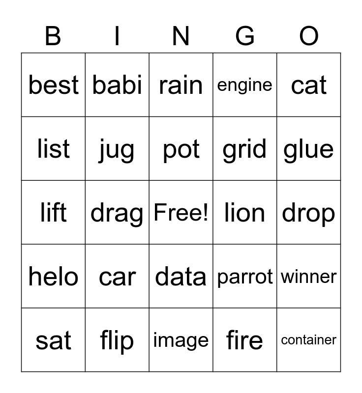This bingo card has a free space and 34 words: blue, fire, four, one, helo, jug, cat, sat, babi, joe, pot, rain, hug, clone, lion, glue, flip, lift, car, parrot, data, lex, best, drop, image, container, engine, public, grid, list, view, drag, winner and circle.