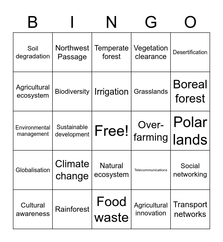 This bingo card has a free space and 35 words: Biome, Food security, Vegetation, Biodiversity, Natural ecosystem, Vegetation clearance, Agricultural ecosystem, Non-native plants, Irrigation, Crop yields, Environmental management, Desertification, Salinity, Water scarcity, Soil degradation, Over-farming, Agricultural innovation, Sustainable development, Globalisation, Transport networks, Telecommunications, Cultural awareness, Social networking, Rainforest, Temperate forest, Boreal forest, Desert, Tundra, Grasslands, Polar lands, Population growth, Food waste, Climate change, Northwest Passage and Khyber Pass.