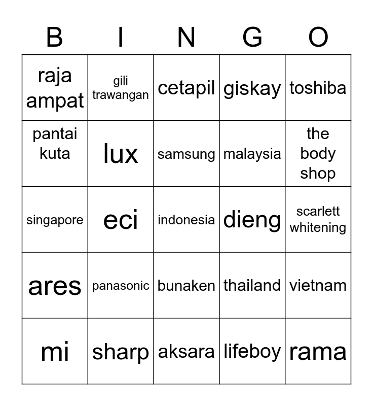 This bingo card has a free space and 24 words: panasonic, sharp, samsung, mi, toshiba, raja ampat, pantai kuta, gili trawangan, dieng, bunaken, malaysia, singapore, thailand, vietnam, lux, lifeboy, scarlett whitening, cetapil, the body shop, eci, rama, ares, giskay and aksara.