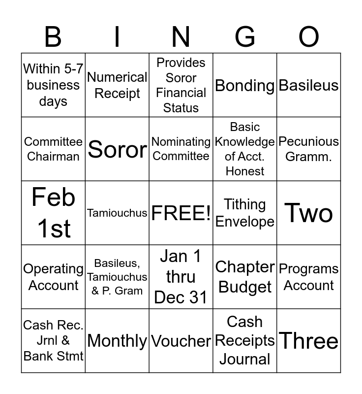 This bingo card has a free space and 24 words: Basileus, Tamiouchus & P. Gram, Monthly, Nominating Committee, Cash Rec. Jrnl & Bank Stmt, Basileus, Within 5-7 business days, Committee Chairman, Numerical Receipt, Tithing Envelope, Jan 1 thru Dec 31, Basic Knowledge of Acct. Honest, Feb 1st, Chapter Budget, Programs Account, Soror, Cash Receipts Journal, Two, Provides Soror Financial Status, Pecunious Gramm., Tamiouchus, Three, Operating Account, Bonding and Voucher.