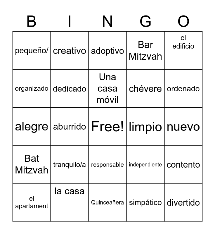 This bingo card has a free space and 24 words: tranquilo/a, la casa, Una casa móvil, el apartament, el edificio, pequeño/, organizado, creativo, limpio, responsable, chévere, alegre, independiente, contento, dedicado, simpático, nuevo, adoptivo, ordenado, aburrido, divertido, Bat Mitzvah, Bar Mitzvah and Quinceañera.