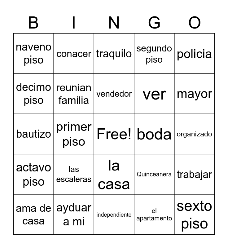 This bingo card has a free space and 24 words: las escaleras, ayduar a mi, vendedor, ama de casa, policia, naveno piso, decimo piso, conacer, boda, la casa, ver, bautizo, Quinceanera, trabajar, reunian familia, el apartamento, organizado, traquilo, mayor, primer piso, sexto piso, actavo piso, segundo piso and independiente.