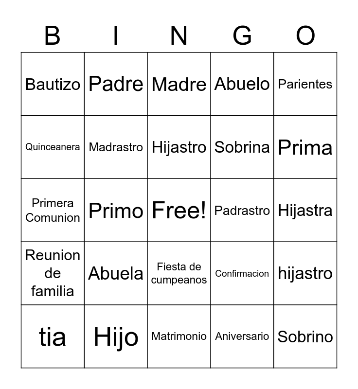 This bingo card has a free space and 24 words: Abuela, Hijo, Hijastro, tia, Parientes, Bautizo, Quinceanera, Padre, Padrastro, Fiesta de cumpeanos, Sobrina, Primera Comunion, Confirmacion, hijastro, Madrastro, Aniversario, Hijastra, Madre, Prima, Primo, Sobrino, Reunion de familia, Abuelo and Matrimonio.