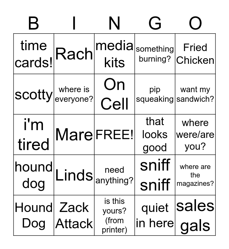 This bingo card has a free space and 24 words: Linds, Zack Attack, On Cell, Hound Dog, Fried Chicken, time cards!, scotty, Rach, that looks good, need anything?, pip squeaking, i'm tired, sniff sniff, where are the magazines?, where is everyone?, quiet in here, where were/are you?, media kits, want my sandwich?, Mare, sales gals, hound dog, something burning? and is this yours? (from printer).