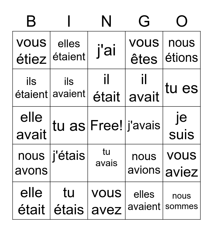 This bingo card has a free space and 24 words: j'étais, tu étais, il était, elle était, nous étions, vous étiez, ils étaient, elles étaient, j'avais, tu avais, il avait, elle avait, nous avions, vous aviez, ils avaient, elles avaient, je suis, j'ai, tu es, tu as, nous sommes, nous avons, vous êtes and vous avez.
