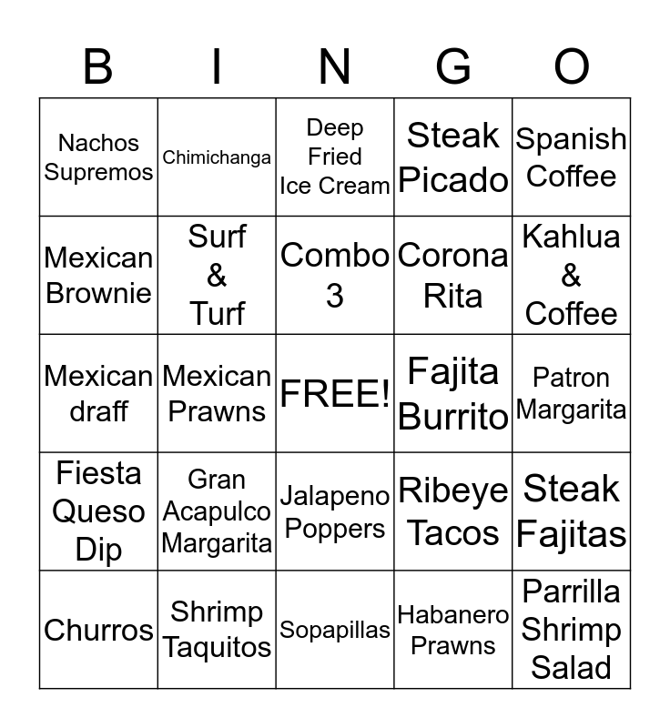 This bingo card has a free space and 24 words: Gran Acapulco Margarita, Shrimp Taquitos, Combo 3, Churros, Spanish Coffee, Nachos Supremos, Mexican Brownie, Chimichanga, Fajita Burrito, Jalapeno Poppers, Corona Rita, Mexican draff, Ribeye Tacos, Steak Fajitas, Surf & Turf, Habanero Prawns, Patron Margarita, Deep Fried Ice Cream, Kahlua & Coffee, Mexican Prawns, Parrilla Shrimp Salad, Fiesta Queso Dip, Steak Picado and Sopapillas.