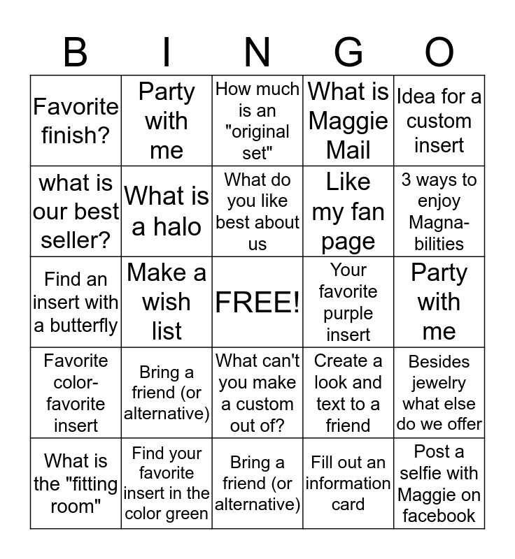 This bingo card has a free space and 24 words: Bring a friend (or alternative), Find your favorite insert in the color green, What do you like best about us, What is the "fitting room", Idea for a custom insert, Favorite finish?, what is our best seller?, Party with me, Your favorite purple insert, What can't you make a custom out of?, Like my fan page, Find an insert with a butterfly, Create a look and text to a friend, Besides jewelry what else do we offer, What is a halo, Fill out an information card, Party with me, How much is an "original set", 3 ways to enjoy Magna-bilities, Make a wish list, Post a selfie with Maggie on facebook, Favorite color-favorite insert, What is Maggie Mail and Bring a friend (or alternative).