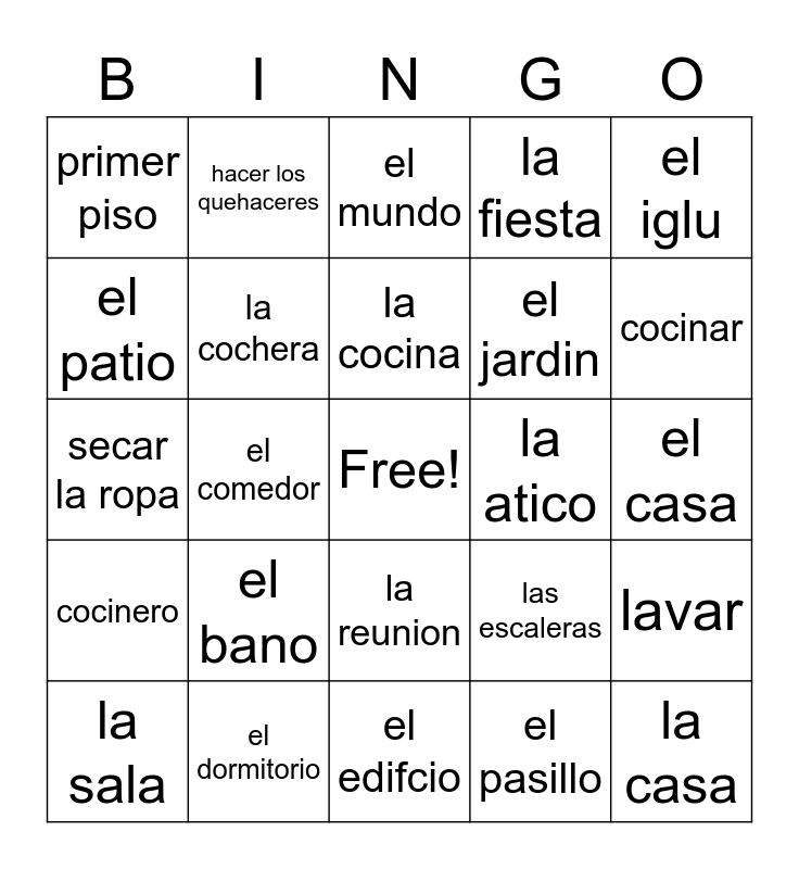 This bingo card has a free space and 24 words: el bano, el dormitorio, la cocina, la sala, el iglu, primer piso, el patio, hacer los quehaceres, la atico, la reunion, el jardin, secar la ropa, las escaleras, lavar, la cochera, el pasillo, el casa, el mundo, cocinar, el comedor, la casa, cocinero, la fiesta and el edifcio.