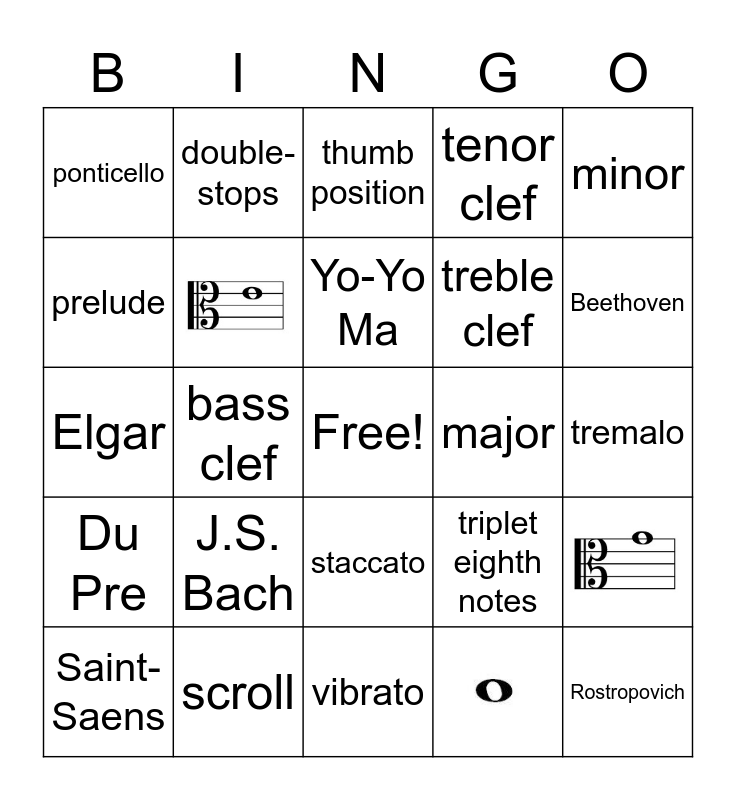 This bingo card has 3 images, a free space and 22 words: J.S. Bach, vibrato, Yo-Yo Ma, Saint-Saens, minor, ponticello, prelude, double-stops, major, staccato, treble clef, Elgar, triplet eighth notes, 4th position, tremalo, thumb position, Beethoven, bass clef, Rostropovich, scroll, Du Pre and tenor clef.