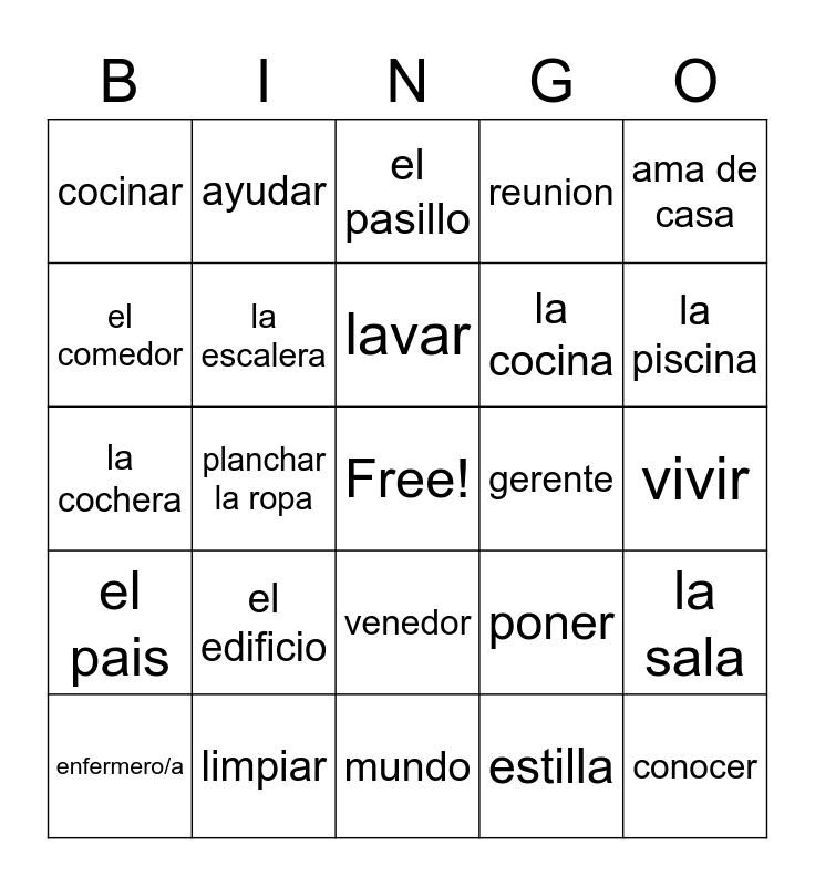 This bingo card has a free space and 24 words: el edificio, limpiar, lavar, enfermero/a, ama de casa, cocinar, el comedor, ayudar, gerente, venedor, la cocina, la cochera, poner, la sala, la escalera, estilla, vivir, el pasillo, la piscina, planchar la ropa, conocer, el pais, reunion and mundo.