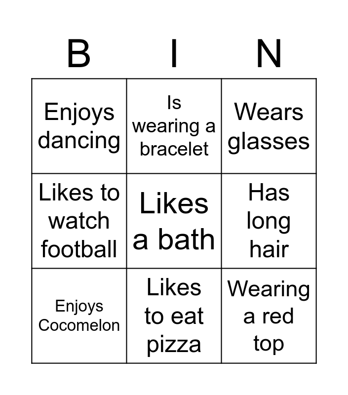 This bingo card has 12 words: Has a pet, Wearing a red top, Likes a bath, Has long hair, Is wearing a bracelet, Wears glasses, Likes to eat pizza, Has a sibling, Enjoys dancing, Likes to watch football, Enjoys Cocomelon and Likes to play sport.