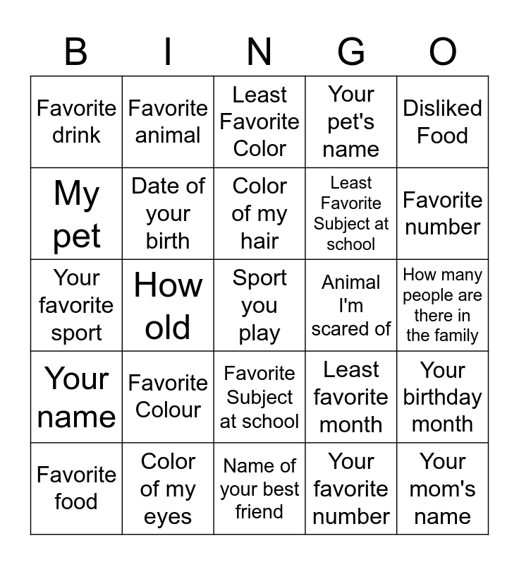 This bingo card has a free space and 24 words: Favorite Colour, Color of my eyes, Color of my hair, Favorite food, Disliked Food, Favorite drink, My pet, Favorite animal, Animal I'm scared of, Favorite Subject at school, Least Favorite Subject at school, Your favorite sport, Least favorite month, Your birthday month, Date of your birth, Your favorite number, How many people are there in the family, Least Favorite Color, Favorite number, How old, Your mom's name, Your name, Your pet's name and Name of your best friend.