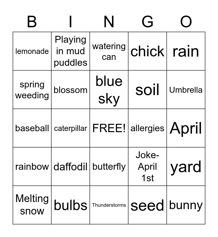 This bingo card has a free space and 40 words: breeze, baseball, bloom, blossom, bulbs, butterfly, blue sky, robin, rain, rainbow, caterpillar, chick, bunny, April, allergies, daffodil, kite, lemonade, open windows, watering can, yard, seed, soil, spring weeding, spring break, Plant garden, Warmer Weather, Spring Cleaning, Frolicking baby animals, Tulips, Poppies, Melting snow, Cherry blossoms, Joke-April 1st, Umbrella, Thunderstorms, Pranks, Fourth Month, Playing in mud puddles and Rain gear.