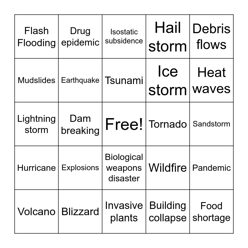 This bingo card has a free space and 24 words: Explosions, Blizzard, Tsunami, Volcano, Debris flows, Flash Flooding, Mudslides, Drug epidemic, Tornado, Biological weapons disaster, Ice storm, Lightning storm, Wildfire, Pandemic, Earthquake, Building collapse, Sandstorm, Isostatic subsidence, Heat waves, Dam breaking, Food shortage, Hurricane, Hail storm and Invasive plants.