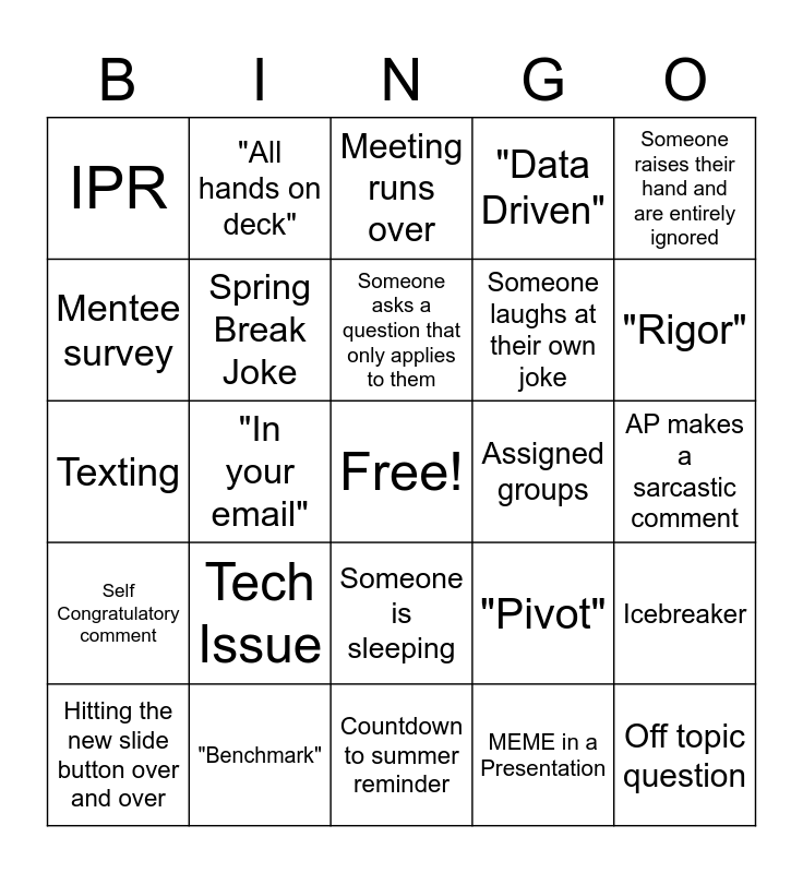 This bingo card has a free space and 24 words: Tech Issue, "Benchmark", Someone asks a question that only applies to them, Hitting the new slide button over and over, Someone raises their hand and are entirely ignored, IPR, Mentee survey, "All hands on deck", Assigned groups, Someone is sleeping, Someone laughs at their own joke, Texting, "Pivot", Icebreaker, Spring Break Joke, MEME in a Presentation, AP makes a sarcastic comment, Meeting runs over, "Rigor", "In your email", Off topic question, Self Congratulatory comment, "Data Driven" and Countdown to summer reminder.