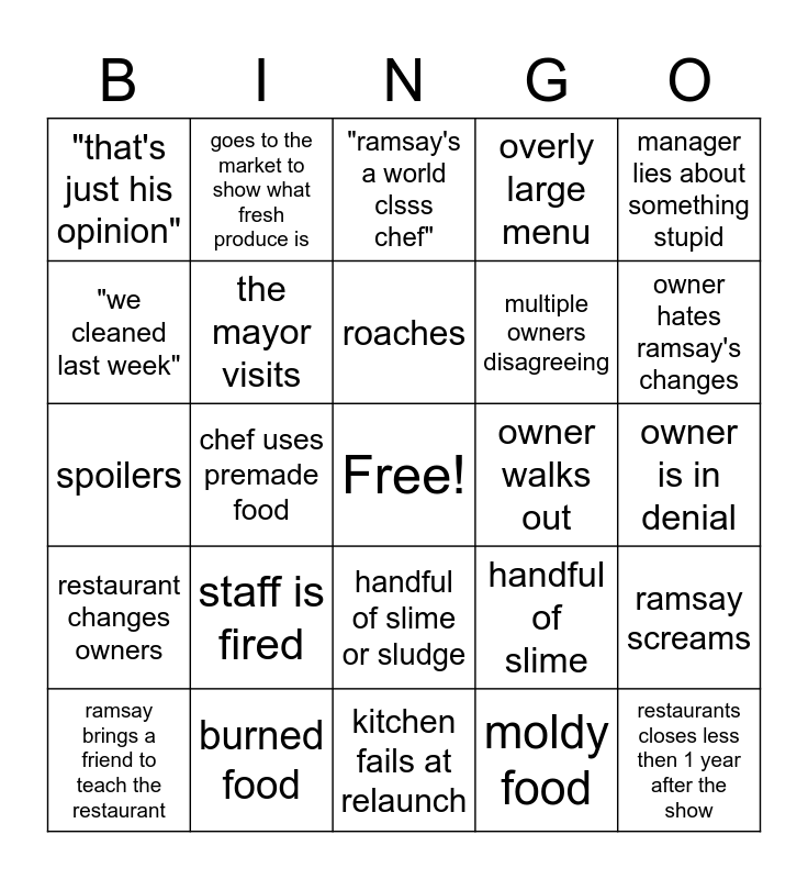 This bingo card has a free space and 42 words: shuts the place down, goes to the market to show what fresh produce is, staff cares more then owner, handful of slime, owner is in denial, ramsay brings a friend to teach the restaurant, staff is fired, non-chef creates the menu, multiple owners disagreeing, owner hates ramsay's changes, spoilers, chef uses premade food, kitchen fails at relaunch, owner walks out, restaurants closes less then 1 year after the show, restaurant changes owners, gordon ramsay enjoys a dish, roaches, cold food, manager lies about something stupid, "we cleaned last week", walk-in below temp, waitress cries, overly large menu, menu items no available, imitation crab, the mayor visits, 80's decor, raw food, ramsay screams, little of no visible signage outside, burned food, "ramsay's a world clsss chef", moldy food, crying family memebers, broken appliance, rats, handful of slime or sludge, broken tables/chairs, mold in walk-in, "that's just his opinion" and excess food in walk-in.