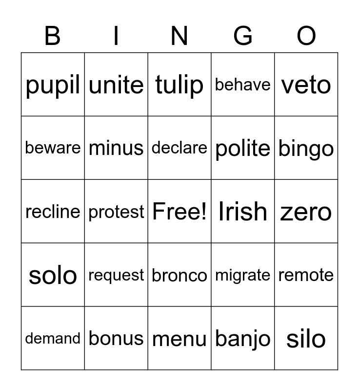 This bingo card has a free space and 29 words: demand, unit, protest, frequent, pupil, tulip, minus, request, Irish, bonus, zero, silo, menu, banjo, bingo, limbo, bronco, solo, veto, recline, migrate, ozone, polite, beware, behave, unite, remote, declare and donate.