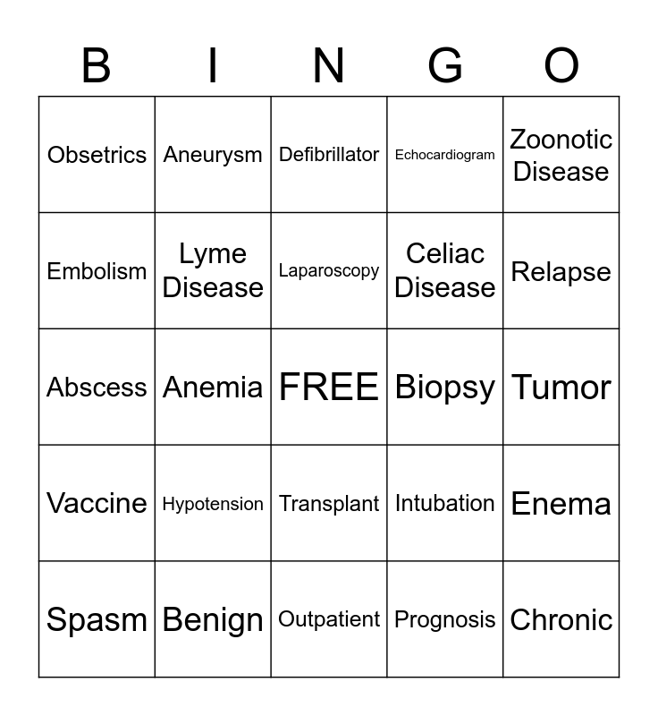 This bingo card has a free space and 29 words: Spasm, Anesthetic, Anemia, Intravenous, Obsetrics, Defibrillator, Lyme Disease, Hypotension, Biopsy, Benign, Tumor, Chronic, Outpatient, Prognosis, Relapse, Sutures, Transplant, Vaccine, Zoonotic Disease, Abscess, Intubation, Cyst, Celiac Disease, Embolism, Echocardiogram, Aneurysm, Enema, Laparoscopy and Caesarean section.