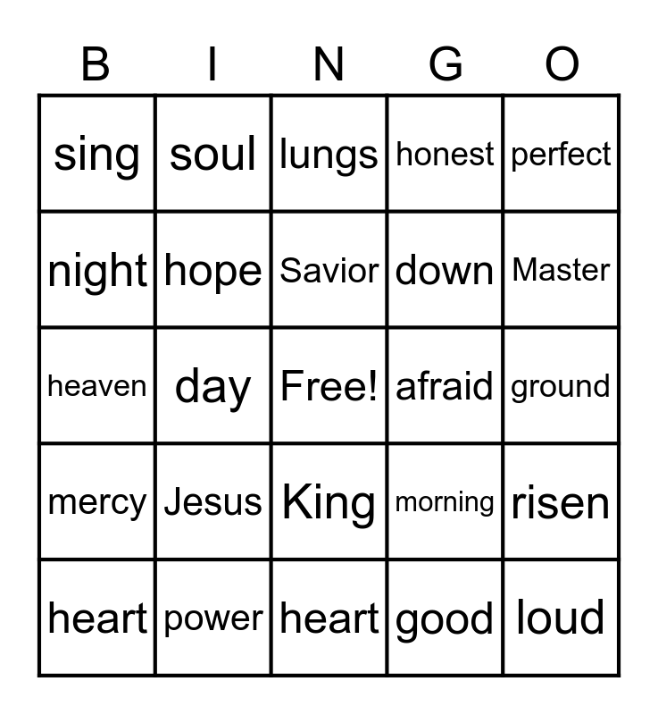 This bingo card has a free space and 29 words: heart, love, day, blood, sing, lungs, hope, Jesus, afraid, power, ground, loud, heart, good, Master, praise, King, mercy, perfect, heaven, morning, worship, down, night, honest, soul, risen, Savior and God.