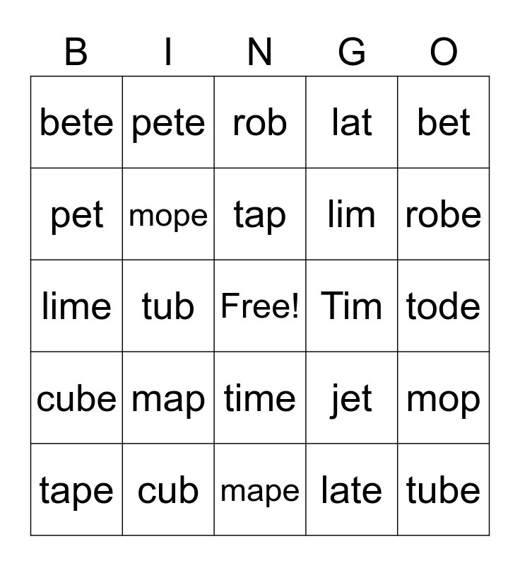This bingo card has a free space and 25 words: map, mape, tap, tape, bet, bete, pet, pete, Tim, time, lim, lime, jet, mop, mope, tod, tode, rob, robe, tub, tube, cub, cube, lat and late.