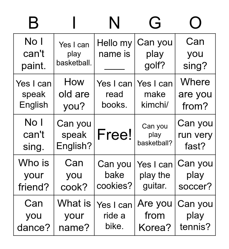This bingo card has a free space and 24 words: Can you cook?, What is your name?, Yes I can read books., Can you dance?, Can you sing?, No I can't paint., Yes I can speak English, Yes I can play basketball., Can you play basketball?, Can you bake cookies?, Yes I can make kimchi/, No I can't sing., Yes I can play the guitar., Can you play soccer?, How old are you?, Are you from Korea?, Can you run very fast?, Hello my name is ____, Where are you from?, Can you speak English?, Can you play tennis?, Who is your friend?, Can you play golf? and Yes I can ride a bike..
