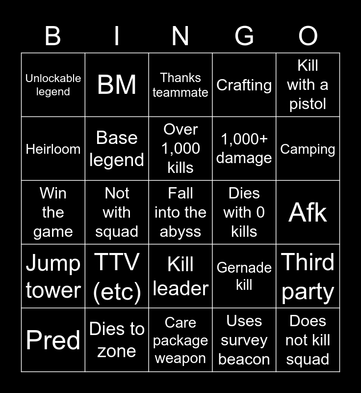 This bingo card has a free space and 24 words: TTV (etc), Dies to zone, Over 1,000 kills, Pred, Kill with a pistol, Unlockable legend, Heirloom, BM, Dies with 0 kills, Kill leader, 1,000+ damage, Win the game, Gernade kill, Third party, Base legend, Uses survey beacon, Afk, Thanks teammate, Camping, Not with squad, Does not kill squad, Jump tower, Crafting and Care package weapon.