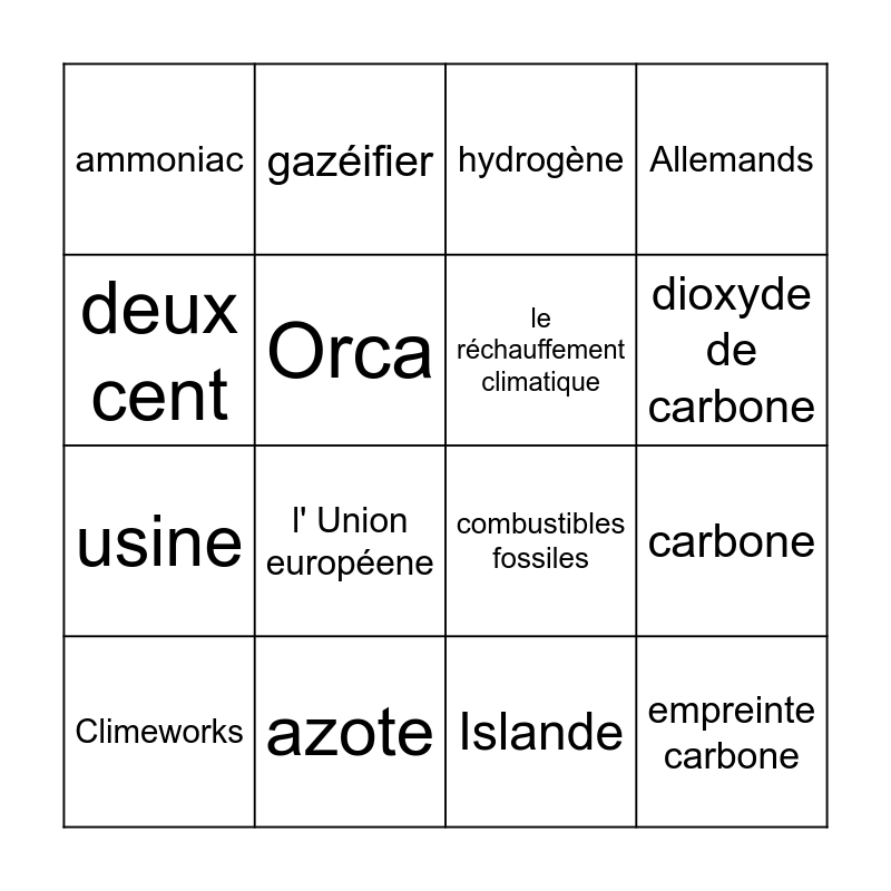 This bingo card has 16 words: azote, carbone, hydrogène, ammoniac, usine, gazéifier, combustibles fossiles, Islande, deux cent, Orca, Climeworks, Allemands, l' Union européene, dioxyde de carbone, le réchauffement climatique and empreinte carbone.