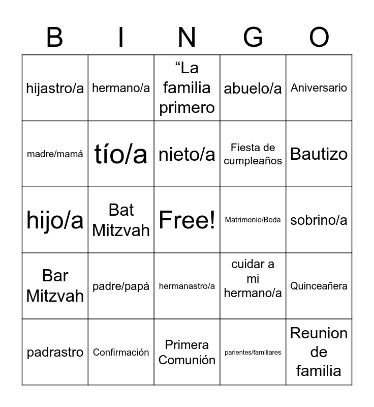 This bingo card has a free space and 24 words: padre/papá, Confirmación, nieto/a, padrastro, Aniversario, hijastro/a, madre/mamá, hermano/a, Matrimonio/Boda, hermanastro/a, Fiesta de cumpleaños, hijo/a, cuidar a mi hermano/a, Quinceañera, tío/a, parientes/familiares, sobrino/a, “La familia primero, Bautizo, Bat Mitzvah, Reunion de familia, Bar Mitzvah, abuelo/a and Primera Comunión.