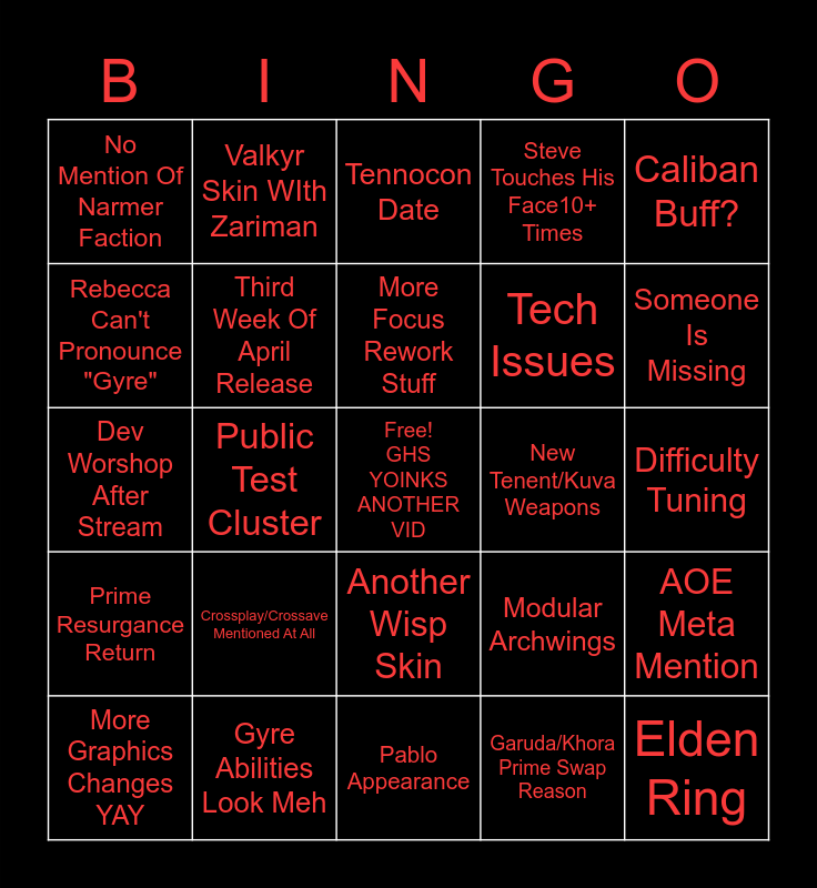This bingo card has a free space and 24 words: Crossplay/Crossave Mentioned At All, Gyre Abilities Look Meh, More Focus Rework Stuff, More Graphics Changes YAY, Caliban Buff?, No Mention Of Narmer Faction, Rebecca Can't Pronounce "Gyre", Valkyr Skin WIth Zariman, New Tenent/Kuva Weapons, Another Wisp Skin, Tech Issues, Dev Worshop After Stream, Modular Archwings, AOE Meta Mention, Third Week Of April Release, Garuda/Khora Prime Swap Reason, Difficulty Tuning, Tennocon Date, Someone Is Missing, Public Test Cluster, Elden Ring, Prime Resurgance Return, Steve Touches His Face10+ Times and Pablo Appearance.