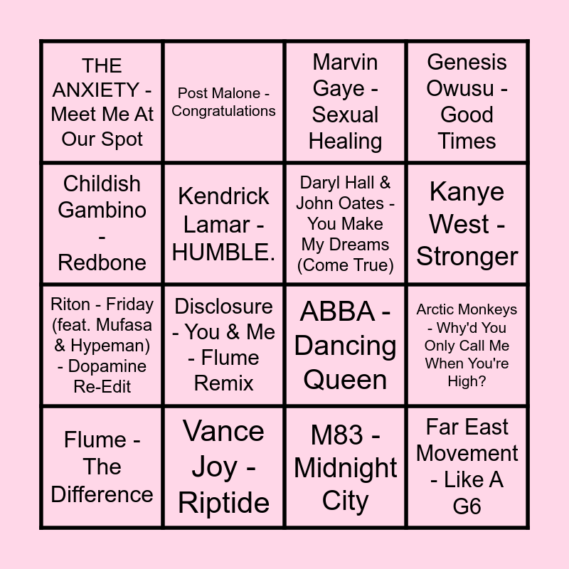 This bingo card has 64 words: Rockwell - Somebody's Watching Me, Glass Animals - Heat Waves, Lil Nas X - INDUSTRY BABY (feat. Jack Harlow), Grover Washington, Jr. - Just the Two of Us (feat. Bill Withers), Lil Nas X - MONTERO (Call Me By Your Name), Client Liaison - World Of Our Love, Post Malone - Congratulations, Kendrick Lamar - King Kunta, Kanye West - Stronger, Nelly Furtado - Maneater, Touch Sensitive - Lay Down, Chet Faker - Talk Is Cheap, M83 - Midnight City, Childish Gambino - Redbone, Disclosure - Latch, Kendrick Lamar - HUMBLE., Arctic Monkeys - Why'd You Only Call Me When You're High?, THE ANXIETY - Meet Me At Our Spot, The Weeknd - Blinding Lights, Riton - Friday (feat. Mufasa & Hypeman) - Dopamine Re-Edit, Justin Bieber - Peaches (feat. Daniel Caesar & Giveon), Far East Movement - Like A G6, Genesis Owusu - Good Times, Elton John - Cold Heart - PNAU Remix, ACRAZE - Do It To It, Frank Ocean - Lost, Yothu Yindi - Treaty, bbno$ - edamame (feat. Rich Brian), Luude - Down Under (feat. Colin Hay), The Wiggles - Elephant - triple j Like A Version, Mac Miller - The Spins, Savage Garden - Truly Madly Deeply, Oliver Tree - Life Goes On, A-Wall - Loverboy, Disclosure - You & Me - Flume Remix, Majestic - Rasputin, Mura Masa - Love$ick, Faith No More - Easy, Stardust - Music Sounds Better With You, Daryl Hall & John Oates - You Make My Dreams (Come True), ABBA - Dancing Queen, Vance Joy - Riptide, The Presets - Downtown Shutdown, Frank Ocean - Chanel, NEIL FRANCES - Music Sounds Better with You, Flume - The Difference, Estelle - American Boy, Glass Animals - Heat Waves (with iann dior), Bruno Mars - Smokin Out The Window, The Weeknd - Take My Breath, Kim Carnes - Bette Davis Eyes, Metro Station - Shake It, Nelly Furtado - Say It Right, Kanye West - Flashing Lights, Vanessa Carlton - A Thousand Miles, Owl City - Fireflies, Marvin Gaye - Sexual Healing, Cold Chisel - Flame Trees - 2011 Remastered, Red Hot Chili Peppers - Can't Stop, Go West - The King of Wishful Thinking, a-ha - Take on Me, Vampire Weekend - A-Punk, Third Eye Blind - Semi-Charmed Life and Cher - Believe.