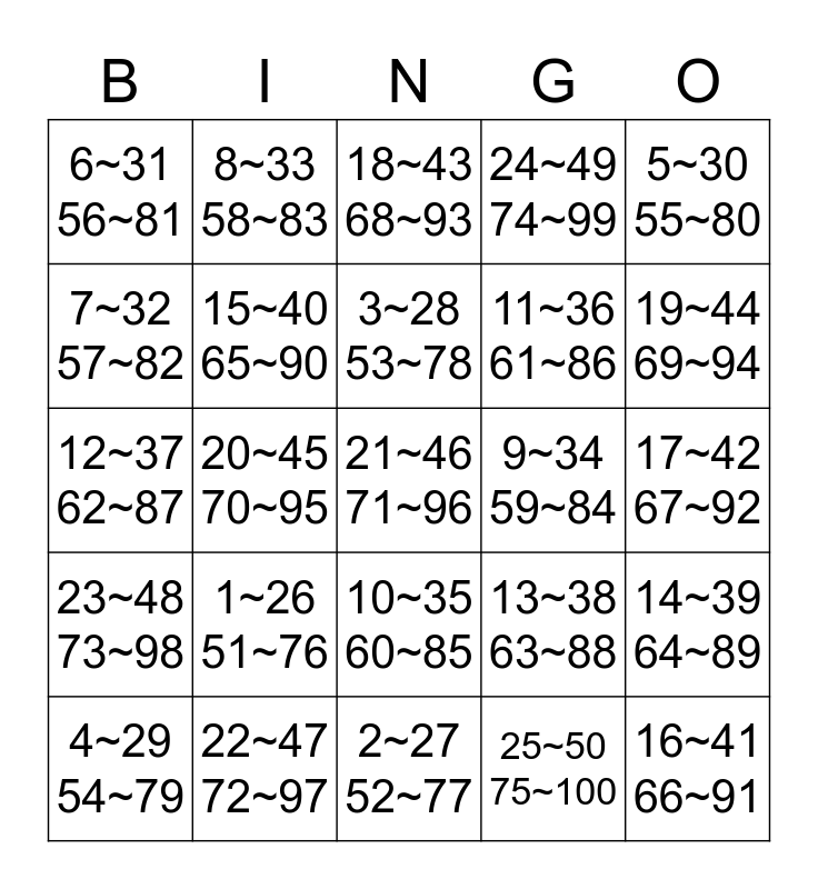 This bingo card has 25 words: 1~26 51~76, 2~27 52~77, 3~28 53~78, 4~29 54~79, 5~30 55~80, 6~31 56~81, 7~32 57~82, 8~33 58~83, 9~34 59~84, 10~35 60~85, 11~36 61~86, 12~37 62~87, 13~38 63~88, 14~39 64~89, 15~40 65~90, 16~41 66~91, 17~42 67~92, 18~43 68~93, 19~44 69~94, 20~45 70~95, 21~46 71~96, 22~47 72~97, 23~48 73~98, 24~49 74~99 and 25~50 75~100.
