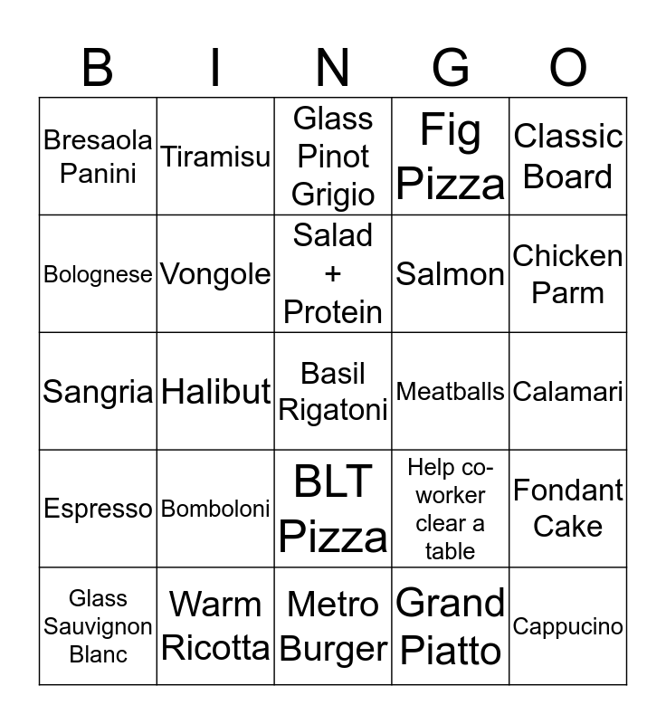 This bingo card has 25 words: Bomboloni, Metro Burger, Salad + Protein, Glass Sauvignon Blanc, Classic Board, Bresaola Panini, Bolognese, Tiramisu, Meatballs, BLT Pizza, Salmon, Sangria, Help co-worker clear a table, Fondant Cake, Vongole, Cappucino, Calamari, Glass Pinot Grigio, Chicken Parm, Halibut, Basil Rigatoni, Warm Ricotta, Espresso, Fig Pizza and Grand Piatto.