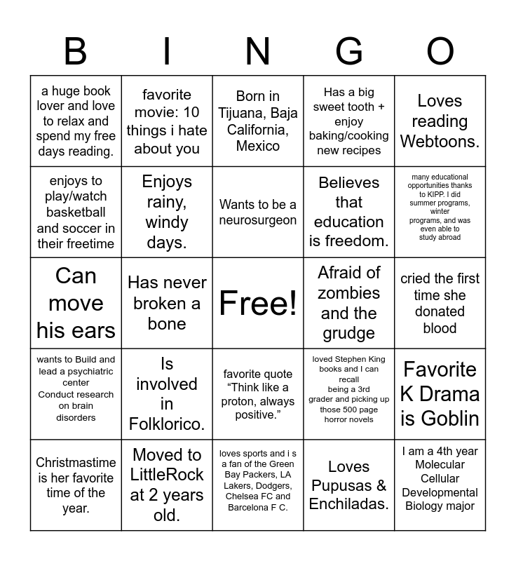 This bingo card has a free space and 24 words: Is involved in Folklorico., Moved to LittleRock at 2 years old., Wants to be a neurosurgeon, Christmastime is her favorite time of the year., Loves reading Webtoons., a huge book lover and love to relax and spend my free days reading., enjoys to play/watch basketball and soccer in their freetime, favorite movie: 10 things i hate about you, Afraid of zombies and the grudge, favorite quote “Think like a proton, always positive.”, Believes that education is freedom., Can move his ears, loved Stephen King books and I can recall being a 3rd grader and picking up those 500 page horror novels, Favorite K Drama is Goblin, Enjoys rainy, windy days., Loves Pupusas & Enchiladas., cried the first time she donated blood, Born in Tijuana, Baja California, Mexico, many educational opportunities thanks to KIPP. I did summer programs, winter programs, and was even able to study abroad, Has never broken a bone, I am a 4th year Molecular Cellular Developmental Biology major, wants to Build and lead a psychiatric center Conduct research on brain disorders, Has a big sweet tooth + enjoy baking/cooking new recipes and loves sports and i s a fan of the Green Bay Packers, LA Lakers, Dodgers, Chelsea FC and Barcelona F C..