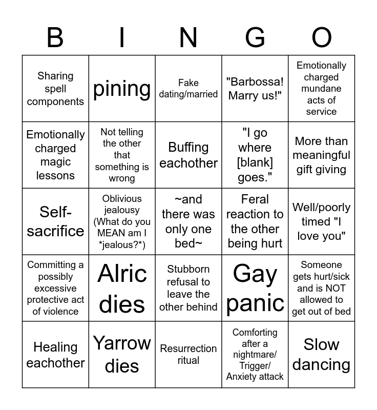 This bingo card has a free space and 24 words: Alric dies, Yarrow dies, Buffing eachother, Healing eachother, Emotionally charged mundane acts of service, Sharing spell components, Emotionally charged magic lessons, pining, Feral reaction to the other being hurt, Stubborn refusal to leave the other behind, "I go where [blank] goes.", Self-sacrifice, Gay panic, Someone gets hurt/sick and is NOT allowed to get out of bed, Not telling the other that something is wrong, Comforting after a nightmare/ Trigger/ Anxiety attack, Well/poorly timed "I love you", Fake dating/married, More than meaningful gift giving, Oblivious jealousy (What do you MEAN am I *jealous?*), Slow dancing, Committing a possibly excessive protective act of violence, "Barbossa! Marry us!" and Resurrection ritual.