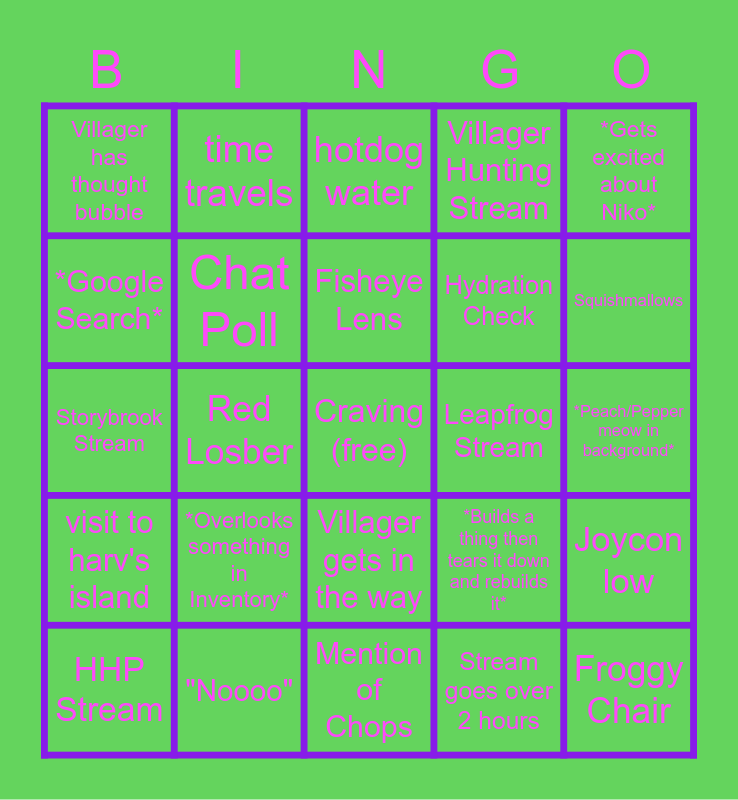 This bingo card has a free space and 28 words: Joycon low, Joycon depleted, Hydration Check, Stream goes over 2 hours, *Google Search*, hotdog water, time travels, visit to harv's island, Leapfrog Stream, HHP Stream, Storybrook Stream, Villager Hunting Stream, "Noooo", Mention of Chops, Squishmallows, Target, *Overlooks something in Inventory*, Chat Poll, Fisheye Lens, Villager gets in the way, Villager has thought bubble, Keroppi Snack, Froggy Chair, Red Losber, *Peach/Pepper meow in background*, *Builds a thing then tears it down and rebuilds it*, *Gets excited about Niko* and *Doesn't have a slingshot*.