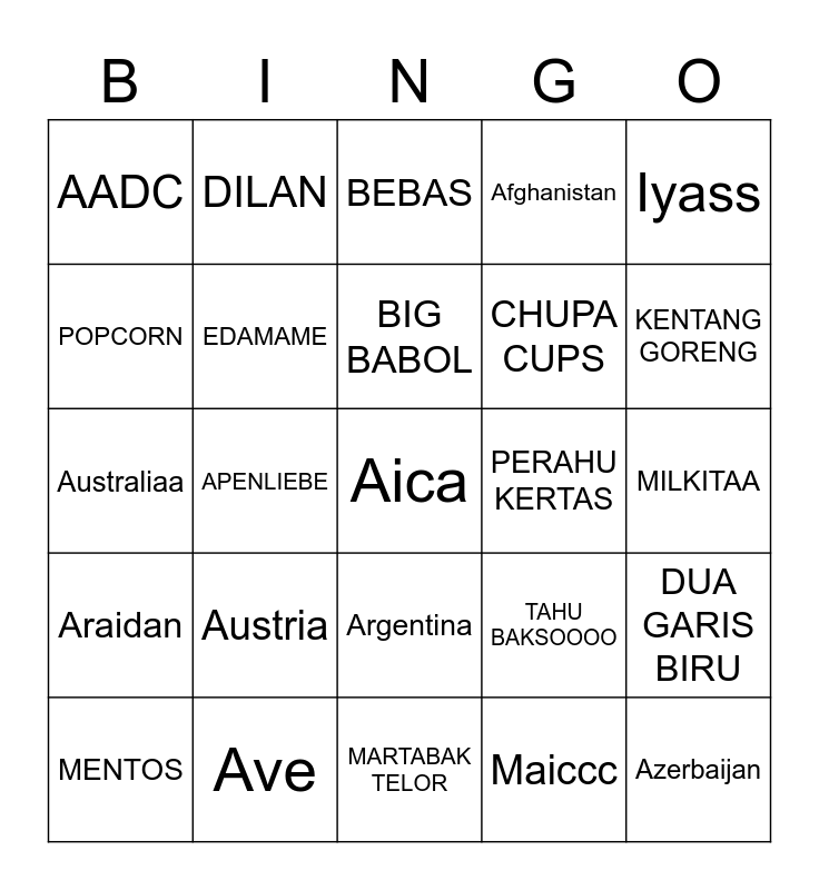 This bingo card has 25 words: Araidan, Ave, Aica, Maiccc, Iyass, AADC, DILAN, BEBAS, PERAHU KERTAS, DUA GARIS BIRU, POPCORN, EDAMAME, MARTABAK TELOR, TAHU BAKSOOOO, KENTANG GORENG, MENTOS, APENLIEBE, BIG BABOL, CHUPA CUPS, MILKITAA, Australiaa, Austria, Argentina, Afghanistan and Azerbaijan.