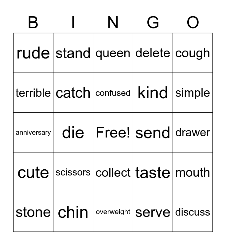 This bingo card has a free space and 41 words: abroad, anniversary, argue, catch, chin, collect, confused, cool, cough, cute, die, delete, discuss, drawer, send, scissors, salary, rude, rule, queen, mouth, nervous, overweight, kind, magic, serious, serve, sharp, simple, snake, soft, stand, stone, tailor, taste, terrible, vacation, voice, war, weather and water.