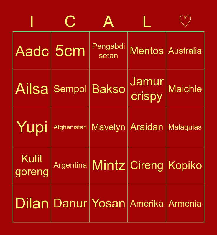 This bingo card has 25 words: Argentina, Yosan, Bakso, Dilan, Australia, Aadc, Ailsa, 5cm, Araidan, Mintz, Jamur crispy, Yupi, Cireng, Kopiko, Sempol, Armenia, Malaquias, Pengabdi setan, Maichle, Afghanistan, Mavelyn, Danur, Kulit goreng, Mentos and Amerika.