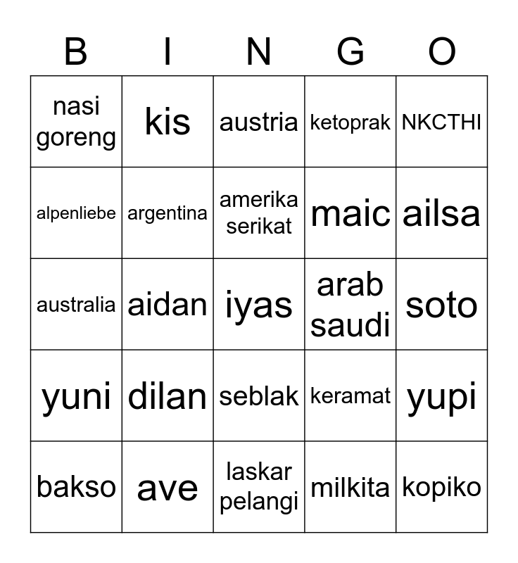 This bingo card has a free space and 24 words: dilan, ave, amerika serikat, bakso, NKCTHI, nasi goreng, alpenliebe, kis, arab saudi, seblak, maic, australia, keramat, yupi, argentina, milkita, soto, austria, ailsa, aidan, kopiko, yuni, ketoprak and laskar pelangi.