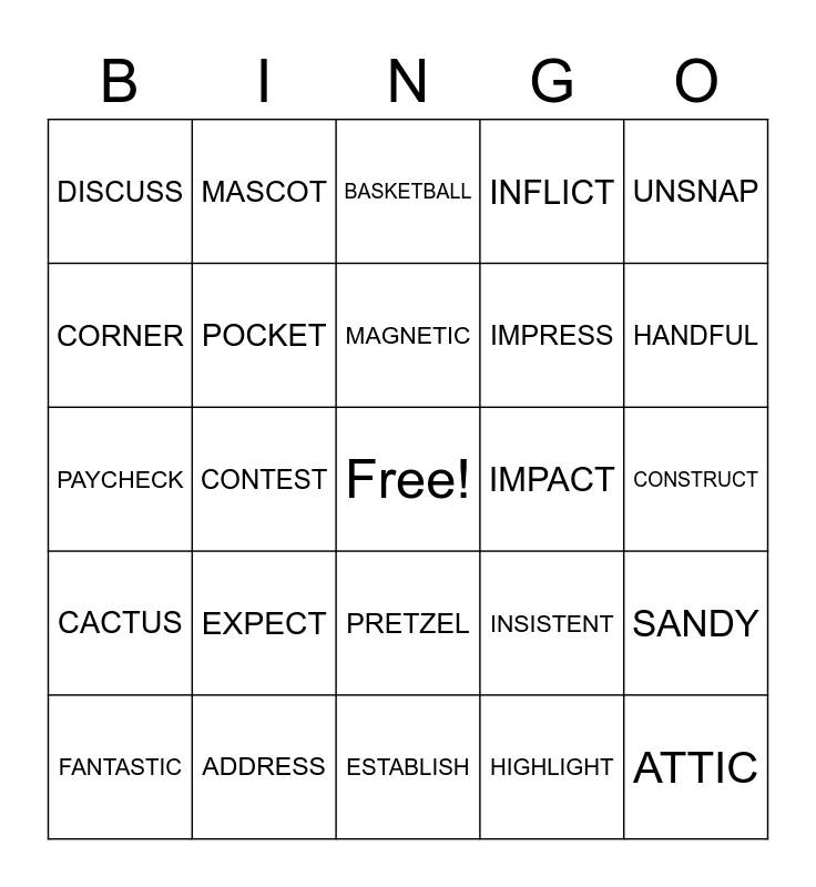 This bingo card has a free space and 29 words: FANTASTIC, MAGNET, CONTEST, SQUARE, DISCUSS, BASKETBALL, POCKET, EXPECT, IMPACT, ADDRESS, CONSTRUCT, ATTIC, ESTABLISH, HIGHLIGHT, HANDFUL, WORSE, PRETZEL, CACTUS, UNSNAP, PAYCHECK, INSISTENT, DISGUST, IMPRESS, CORNER, INFLICT, MASCOT, SANDY, MAGNETIC and CALCULATE.